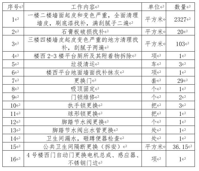 2.木门拆除更换复合烤漆门,安装手柄锁。 3.卫生间部分洗手盆水嘴及蹲便器脚踏阀关闭不严需拆除更换,公共卫生间隔断变型拆除更换。