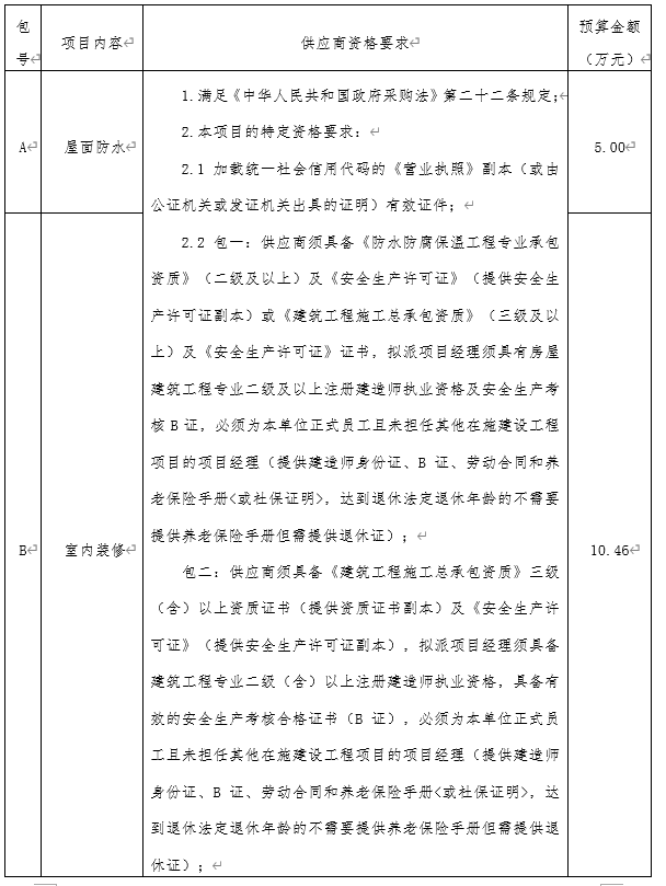 包二:供应商须具备《建筑工程施工总承包资质》三级(含)以上资质证书(提供资质证书副本)及《安全生产许可证》(提供安全生产许可证副本),拟派项目经理须具备建筑工程专业二级(含)以上注册建造师执业资格,具备有效的安全生产考核合格证书(B证),必须为本单位正式员工且未担任其他在施建设工程项目的项目经理(提供建造师身份证、B 证、劳动合同和养老保险手册