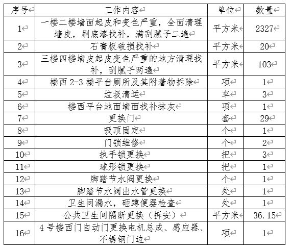 2.木门拆除更换复合烤漆门,安装手柄锁。 3.卫生间部分洗手盆水嘴及蹲便器脚踏阀关闭不严需拆除更换,公共卫生间隔断变型拆除更换。