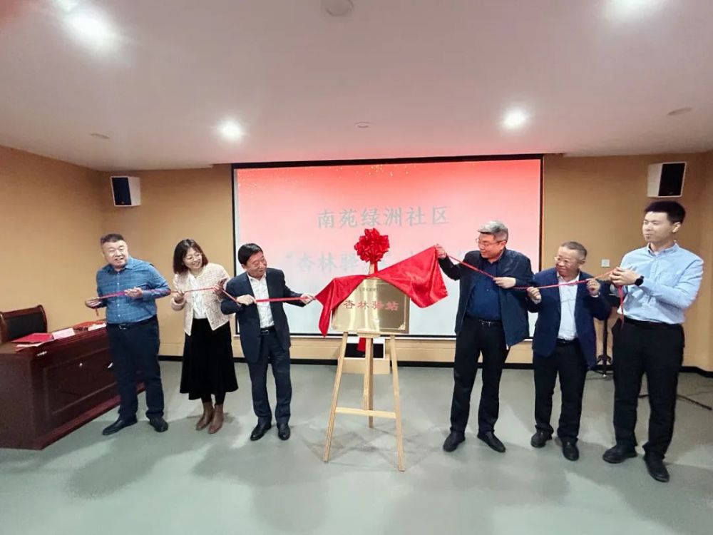 王忠德、黄其来、路中卫、刘迎光、李芳、李海臣共同为南苑绿洲社区“杏林驿站”揭牌。