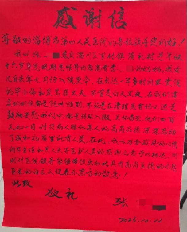我叫张某某,来自淄川区罗村镇演礼村,是年仅十六岁身患晚期恶性骨内瘤患者的妈妈,我女儿自去年九月份入院至今,在长达一年多的时间里,贵院的毕小伟和昃嵩岭医生,不管是白天黑夜,在我们需要的时候都是随叫随到,不论是清理患者伤口还是鼓励安慰我们,都是体贴入微、关怀备至。他们四百天如一日,对待病人胜似亲人的高尚品德,深深感动了我和病房里所有人。在此,我以万分感恩的心情向毕主任和昃医生等医护人员的感谢之意予以转达。同时对医院领导能够带领出如此具有高尚医德、高超医术的白衣天使,表示崇高的敬意。