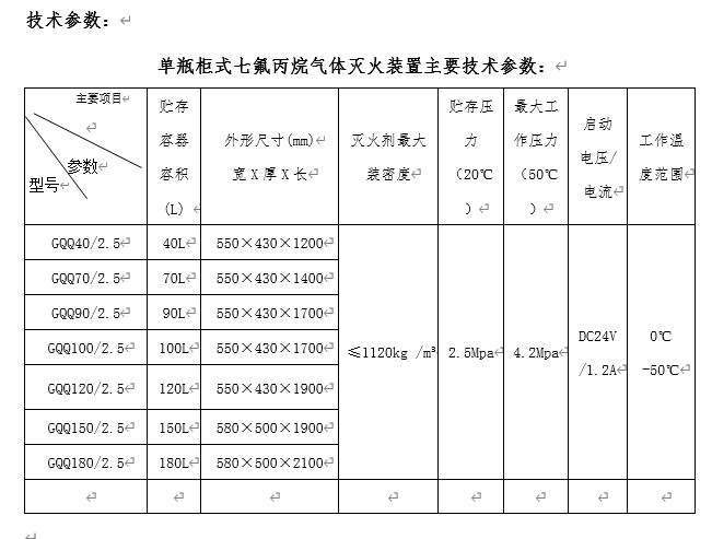其他要求 :1、本次招标采用柜式七氟丙烷气体灭火装置包含灭火剂贮存装置、连接管、喷头、信号反馈装置、电磁型驱动装置、气动型驱动器等部件含安装及调试培训(详见明细表)。电磁型驱动装置,启动电源DC24V 1.2A。