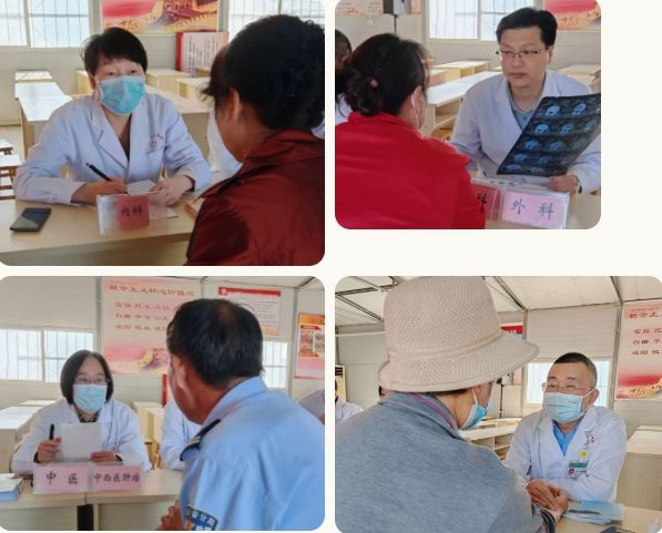 义诊活动吸引了众多村民参与,来自内科、骨科、肿瘤科、感染科等科室的医护人员和党员志愿者耐心详细地询问病情,细致专业地为村民做检查,提出诊疗建议,同时提供血压测量、血糖检测、健康知识普及、预防保健宣教等服务。