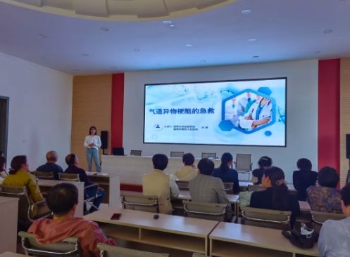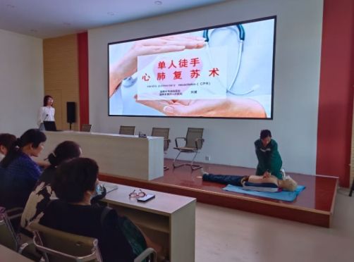 公共卫生科副主任、副主任护师刘健主讲《气道异物梗阻的急救》、《单人徒手心肺复苏术》,现场讲解AED的正确使用方法。