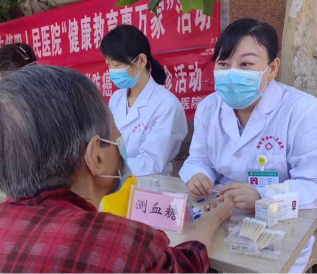 有位91岁高龄老人在儿子的陪同下来到义诊活动现场,医护人员耐心细致地为老人测血糖、量血压、进行血氧检测等,根据检测结果进行健康知识指导,老人及家属被医务人员的优质服务深深地感动并深表谢意!