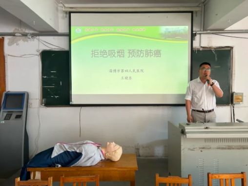 活动现场,淄博市第四人民医院团委书记王晓东以《拒绝吸烟 预防肺癌》为题对师生进行控烟知识宣讲,让大家全面了解烟草的危害,认识控烟对身体健康的重要性,倡导师生们养成文明健康的生活方式,远离烟草危害,打造清新无烟校园。