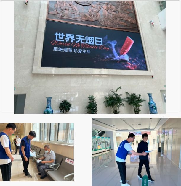 5月29日,志愿者们于医院门诊大厅开展控烟宣教活动。