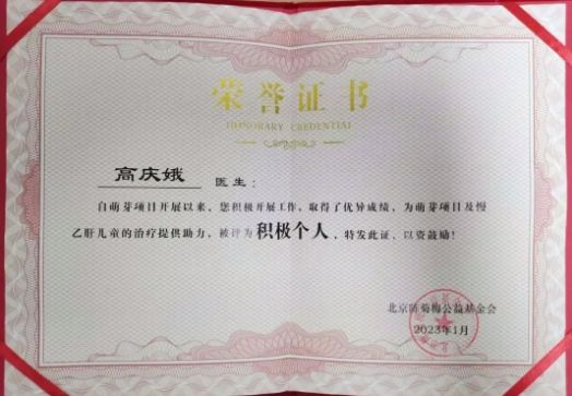 该项目开展以来,淄博市第四人民医院被评为萌芽项目积极医院,高庆娥被评为萌芽项目积极个人。感染四科已为十余名儿童提供个体化、精准化的诊疗方案,目前已有多名儿童实现乙肝临床治愈。