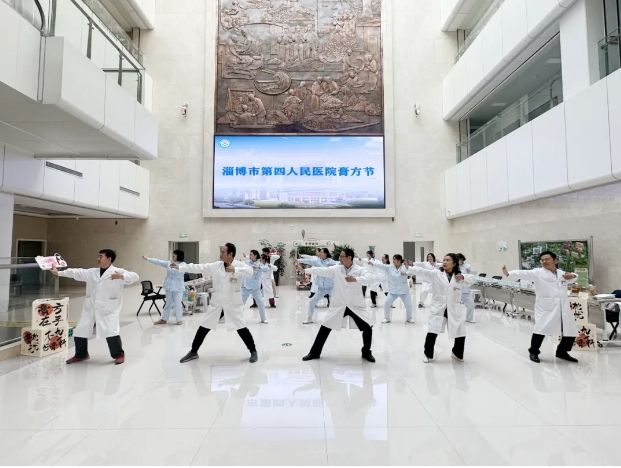 淄博市第四人民医院副院长、市青年名中医王磊、省名中医张亚平、市名中医于洪洲等中医专家、护理人员现场为群众展示八段锦。