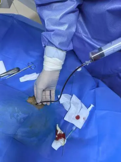 在取得家属的信任及理解后,重症医学科团队根据术前制定的手术方案,结合患者颅脑CT确定穿刺点,成功穿刺并置入引流导管,抽出暗红色血液约40ml,整个操作过程用时约15分钟。