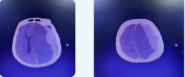 患者封某某,女,72岁,因“突发意识不清3小时”入院急诊,患者在家中摔倒后,当时无任何不适症状。约3小时后其家属发现患者已呼之不应,遂立即送入淄博市第四人民医院急诊。急诊立即开通绿色通道,急查颅脑CT显示硬膜下出血(大量)并形成脑疝。此时患者已深度昏迷,双侧瞳孔对光反射迟钝,呼吸微弱,急诊立即给予止血、脱水降颅压等对症治疗,并紧急收住重症医学科住院治疗。