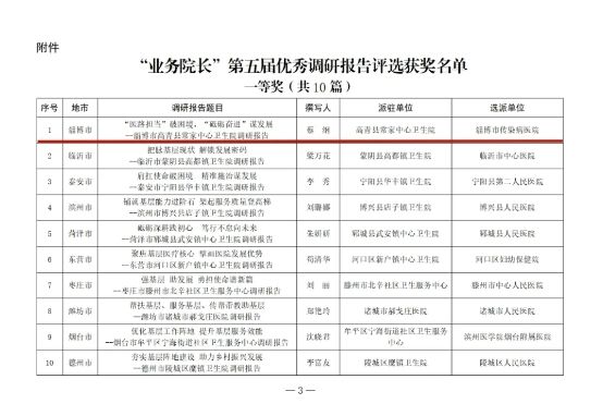 近日,山东省卫生健康委员会发布了2024年省派“业务院长”第五届优秀调研报告评选结果,淄博市第四人民医院省派“业务院长”蔡纲撰写的《“医路担当”破困境,“砥砺奋进”谋发展—淄博市高青县常家中心卫生院调研报告》从全省遴选报送的69篇高质量报告中脱颖而出,荣获一等奖且排名第一。这份荣誉不仅是对医院选派的“业务院长”扎根基层、刻苦钻研、勤勉付出的高度肯定,也彰显了医院在深化医改和助力基层医疗高质量发展方面的使命与担当。