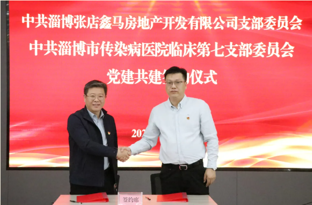 为进一步聚焦党建引领,加强基层党组织建设,助力居民健康福祉,提升区域健康医疗水平,5月9日上午,淄博市第四人民医院临床第七党支部与淄博张店鑫马房地产开发有限公司党支部举行党建共建签约仪式。张店区委社会工作部副部长姜堉丰,淄博张店鑫马房地产开发有限公司党支部书记、总经理杨尚宾,淄博市第四人民医院党委书记尚波,党委副书记张宏伟,临床第七党支部书记王宁和双方相关部门科室负责人参加仪式。