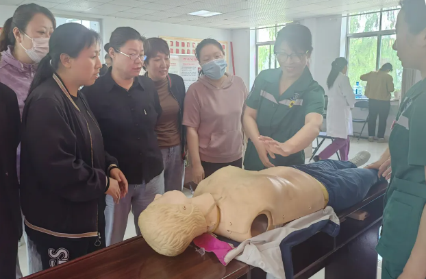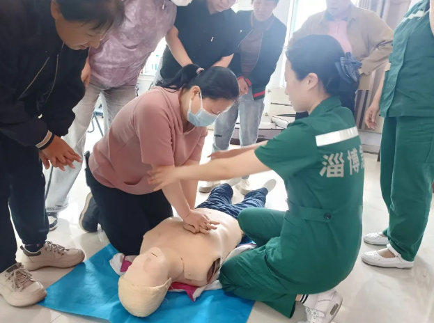 5月14日上午,在淄博经开区南定镇矿机社区的培训现场,全新的培训模式绽放异彩。走上主讲台的护士们精神饱满、自信从容,她们结合丰富的临床经验,将心肺复苏、海姆立克急救法核心急救技能的要点娓娓道来。通过生动鲜活的案例、贴近生活的比喻,原本晦涩的医学知识变得易于理解。而我则在一旁紧密配合,通过标准规范的操作演示,将理论知识具象化,让每一个动作细节都清晰可见。