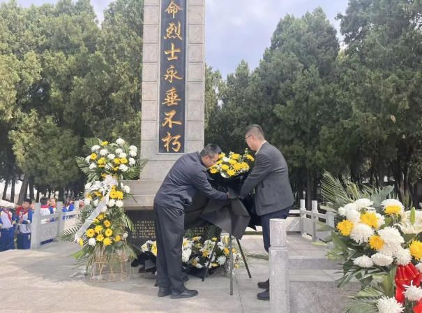 团员青年手持花篮,缓步走向纪念碑,将承载着无限哀思与崇高敬意的花篮敬献于纪念碑基座前。全体人员肃立,致以最深切的缅怀。